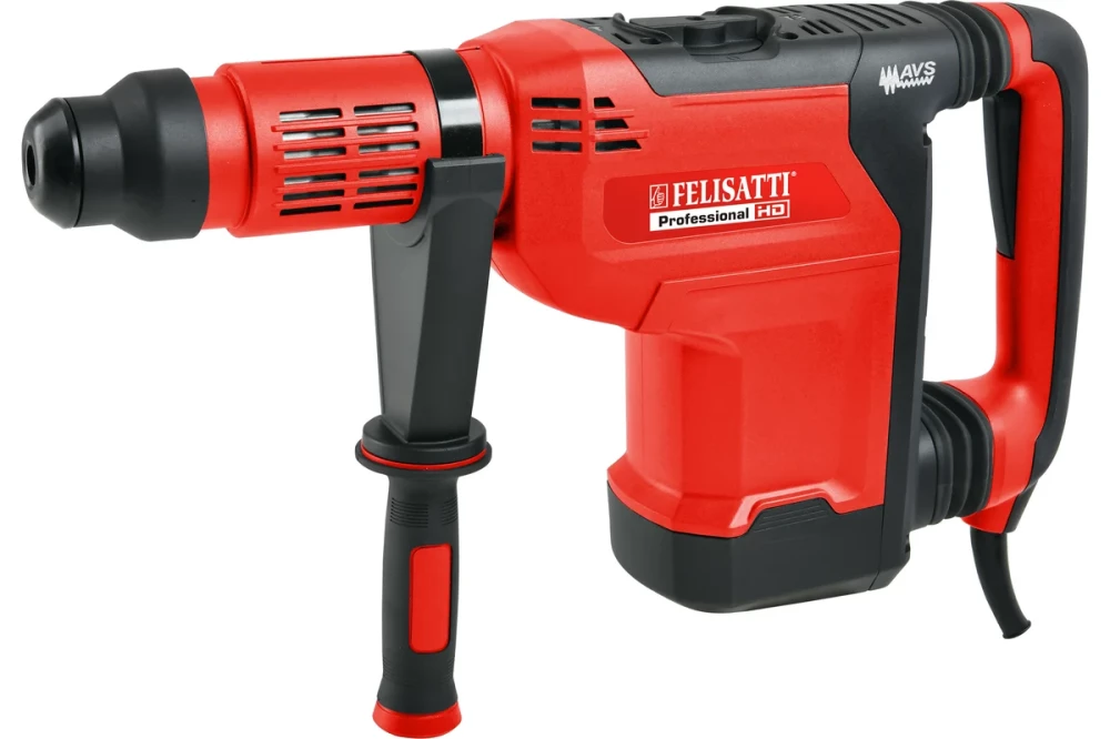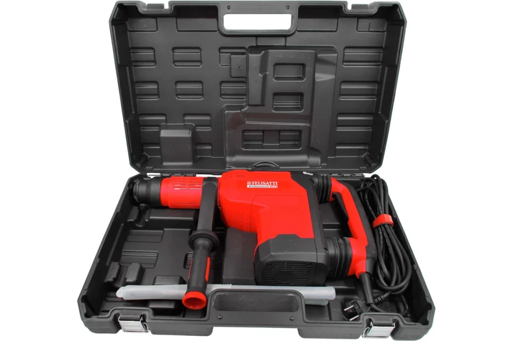 Перфоратор сетевой SDS max 45 FELISATTI с режимом «простого сверления» предназначен для ударного сверления отверстий в бетоне, кирпиче и природном камне, а также для долбежных работ. Предназначен для профессионального применения на промышленных предприятиях и строительстве, а также для работы непрофессиональными пользователями в личных хозяйствах, бытовых и аналогичных условиях. Перфоратор имеет большую мощность в 1500 Вт, что позволяет успешно сверлить с ударом, долбить кирпичную кладку, бетон и природный камень. Перфоратор снабжён предохранительной муфтой, отключающей вращение инструмента при его заклинивании. Перфоратор имеет электронный регулятор скорости вращения, с помощью которого производится настройка на определённый тип выполняемой работы. Инструмент позволяет использовать буры малого диаметра без опасности их выхода из строя. Он также позволяет выполнять отделочные работы и работать с хрупкими материалами, с максимальной точностью производить штробление при отделочных работах. Дополнительная рукоятка может менять своё положение по желанию пользователя, что делает работу более удобной.