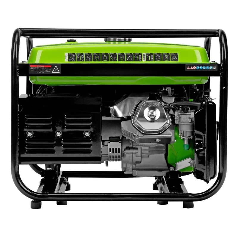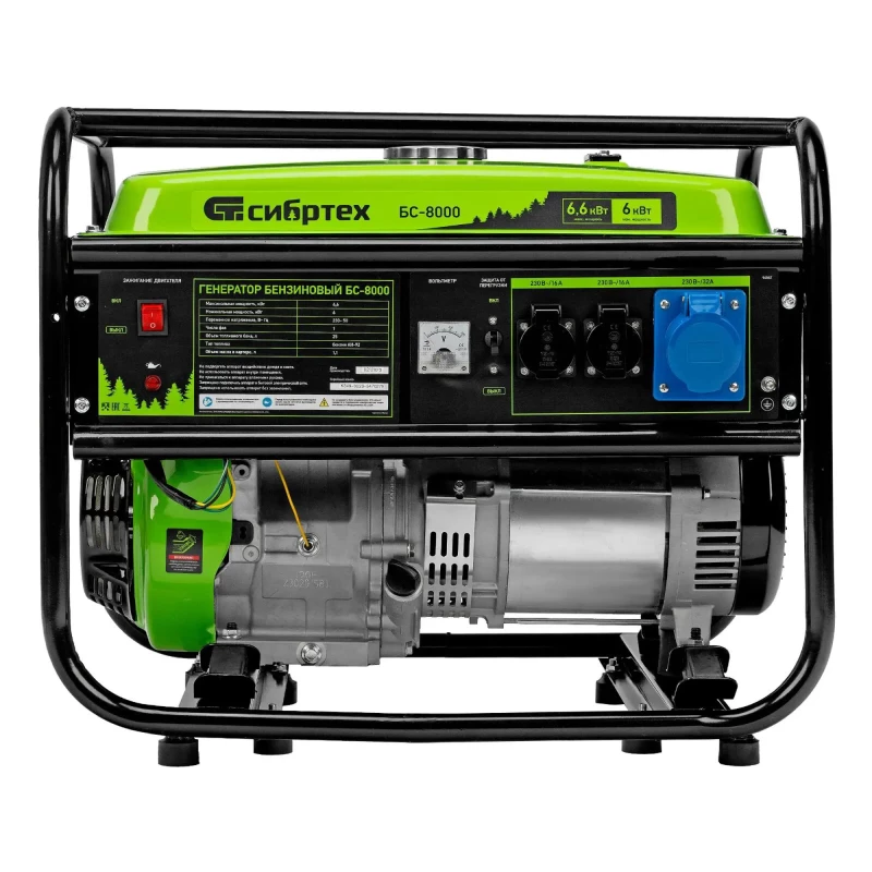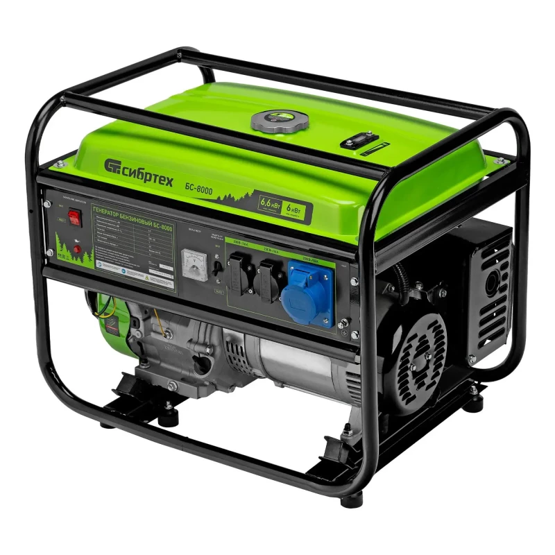 Бензиновый генератор Сибртех БС-8000 94547 на 230 В, с 4-тактным двигателем, с ручным стартером и баком объемом 25 л, вырабатывает 6,6 кВт и отлично подойдет для дачи, стройки, торговой палатки, гаража или мастерской. Высокая мощность и наличие силовой розетки позволяют одновременно подключить мощный водяной насос, электроплиту, а также обеспечить освещение рабочего места. Преимущества: Работа без скачков напряжения — благодаря блоку AVR к генератору можно подключать даже чувствительную технику. Простая эксплуатация — все элементы управления расположены на передней панели. Контроль рабочих параметров — встроенный вольтметр позволяет отслеживать напряжение в сети, а топливный индикатор — уровень бензина в баке. Защита поршневой группы — специальный датчик не допускает старт генератора с низким уровнем масла в картере. Низкий расход топлива — бака объемом 25 л хватает на 8,3 ч работы без дозаправки. Надежность — защита от перегрузки и короткого замыкания продлевает срок службы генератора. Стабильная работа двигателя — медная обмотка альтернатора и металлический распредвал выдерживают высокие нагрузки, система воздушного охлаждения обеспечивает эффективный отвод тепла. Прочная конструкция — стальная рама надежно защищает генератор от повреждений.
