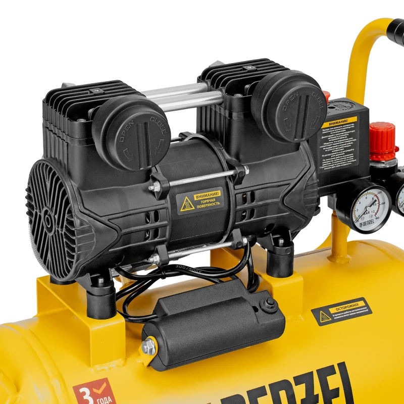 - Наименование Компрессор безмасл. малошумный DLP-950/24, 950Вт,24 л, 2850 об/мин, 170 л/мин Denzel