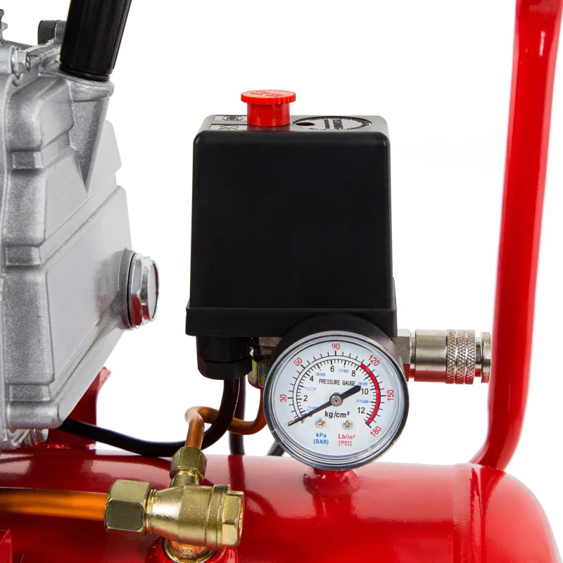 - Удобный контроль давления в ресивере — компрессор оснащен механическим манометром.