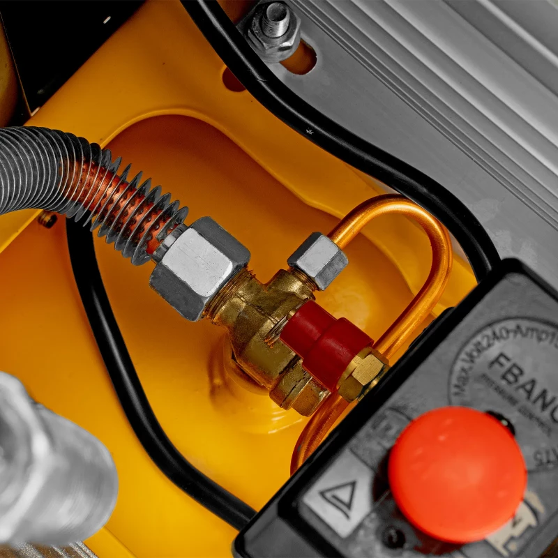 - Автономная работа — прессостат останавливает компрессор по достижении максимального рабочего давления 8 бар и запускает его, если давление падает ниже допустимого уровня.