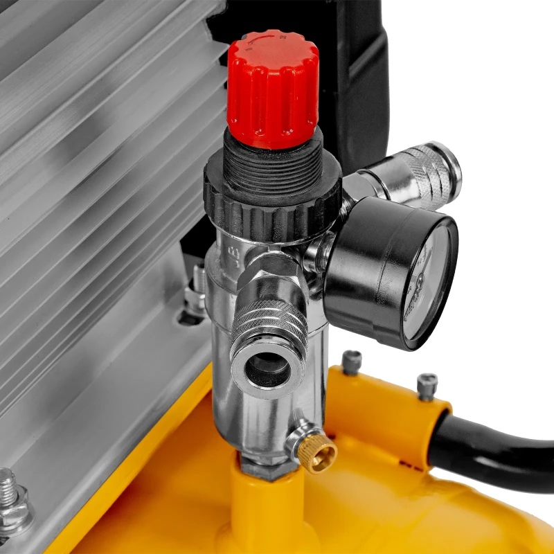 - Удобный контроль давления в ресивере и пневмомагистрали — компрессор оснащен двумя механическими манометрами.