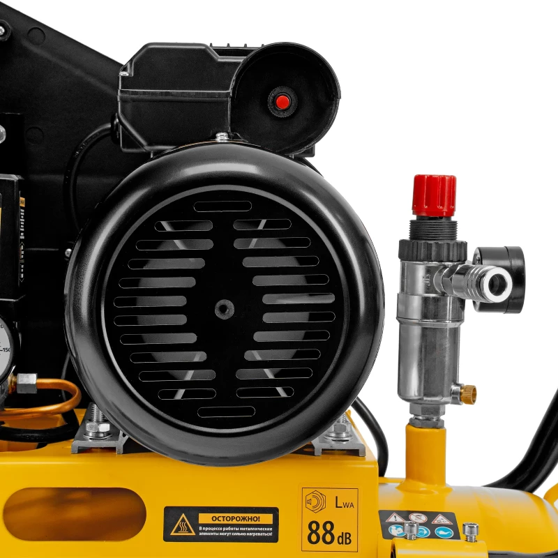 - Безопасность — в случае превышения максимально допустимого давления в ресивере срабатывает предохранительный клапан.