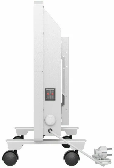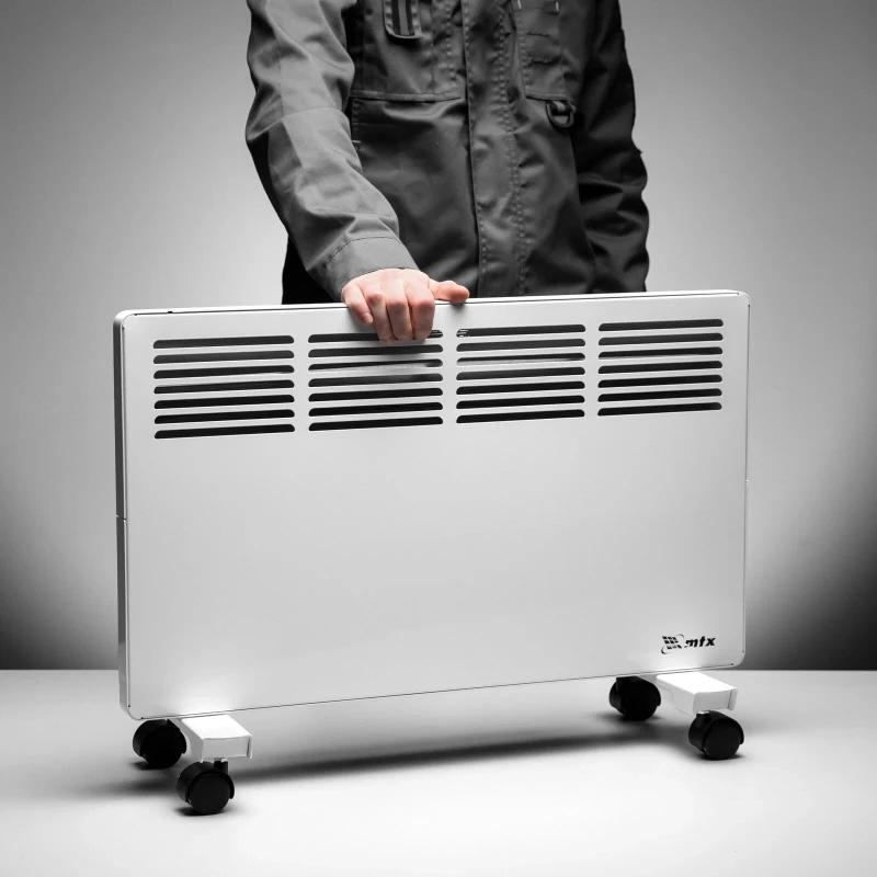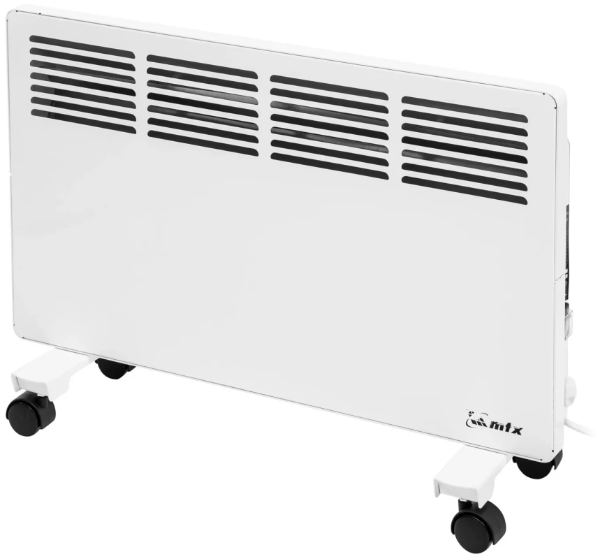 Конвектор электрический MTX KM-1500.2 98125 с X-образным нагревателем, колесами на металлической опоре и термостатом, мощностью 1500 Вт, предназначен для использования в закрытых помещениях: квартирах, офисах, загородных домах, на даче, на производстве и в общественных местах. Рекомендуемая площадь обогрева составляет 20 кв. м. Х-образный нагревательный элемент обеспечивает быстрый и равномерный прогрев помещения до необходимой температуры, при этом не сушит воздух. Преимущества2 режима работы (полный обогрев на мощности 1500 Вт и частичный на 750 Вт) — конвектор позволяет прогревать холодное помещение и поддерживать тепло в отапливаемом. Все выполнено из металла — корпус, колесные опоры, крепежная рамка. Премиум дизайн — глянцевая лицевая панель конвектора хорошо вписывается в интерьер. Антивандальное покрытие «Белая шагрень» — имеет в 3 раза выше прочность относительно обычной краски. Оптимальная циркуляция воздушного потока — внутри конвектора установлен специальный отражающий экран, рассчитанный согласно законам термодинамики. Термозащита — конвектор отключается в случае перегрева, что делает его использование безопасным и предотвращает выход из строя. Удобная настройка и автоматическое поддержание заданных параметров — механический термостат позволяет задать и точно поддерживать температуру в помещении. Комфортная эксплуатация — конвектор не сушит воздух и не сжигает пыль, что исключает появление неприятного запаха в помещении. Надежность и долговечность — Х-образный нагревательный элемент отличается самым большим сроком службы в сравнении с другими нагревательными элементами и обеспечивает равномерную конвекцию без риска локальных перегревов. Возможность использования в ванной комнате — нагревательный элемент выдерживает эксплуатацию в условиях повышенной влажности. Мобильность — колеса облегчают перемещение обогревателя. Два варианта монтажа — конвектор можно расположить на полу или повесить на стену (колесные опоры и кронштейн входят в комплект поставки). Цельнометаллическая крепежная рамка — облегчает монтаж конвектора на стену и повышает жесткость конструкции.