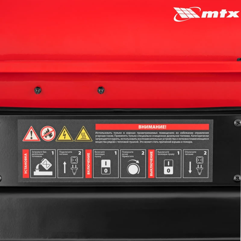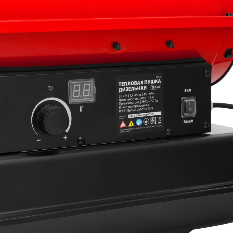 Дизельная тепловая пушка MTX DHB-20i 98905 номинальной тепловой мощностью 20 кВт и производительностью 450 м3/ч, с прямым типом нагрева и термостатом, предназначена для обогрева складов, цехов, теплиц и других нежилых помещений. Также используется на производстве и в строительстве: для прогрева бетона, просушки стен и разморозки траншей. Важно: в обогреваемом помещении необходимо обеспечить хорошую вентиляцию! Преимущества Эффективность — система прямого нагрева позволяет быстро прогреть воздух в помещении до нужной температуры. Автономность — встроенный термостат поддерживает заданную температуру без участия пользователя. Удобный контроль работы — LED-дисплей отображает значения текущей и заданной температуры, а также выводит сообщения об ошибках, манометр позволяет следить за давлением топливного насоса. Экономичность — полного бака хватает более чем на 13 часов работы. Термозащита — в случае перегрева на LED-дисплее возникает ошибка и дизельная пушка отключается. Бесперебойная работа — индикатор уровня топлива позволяет вовремя проводить заправку. Защита от засорения — топливный фильтр препятствует попаданию посторонних частиц в бак, воздушные фильтры обеспечивают чистый поток воздуха. Удобное перемещение — в верхней части корпуса предусмотрена транспортировочная рукоятка.