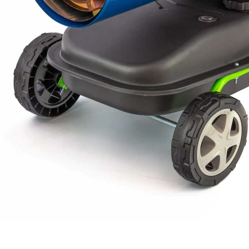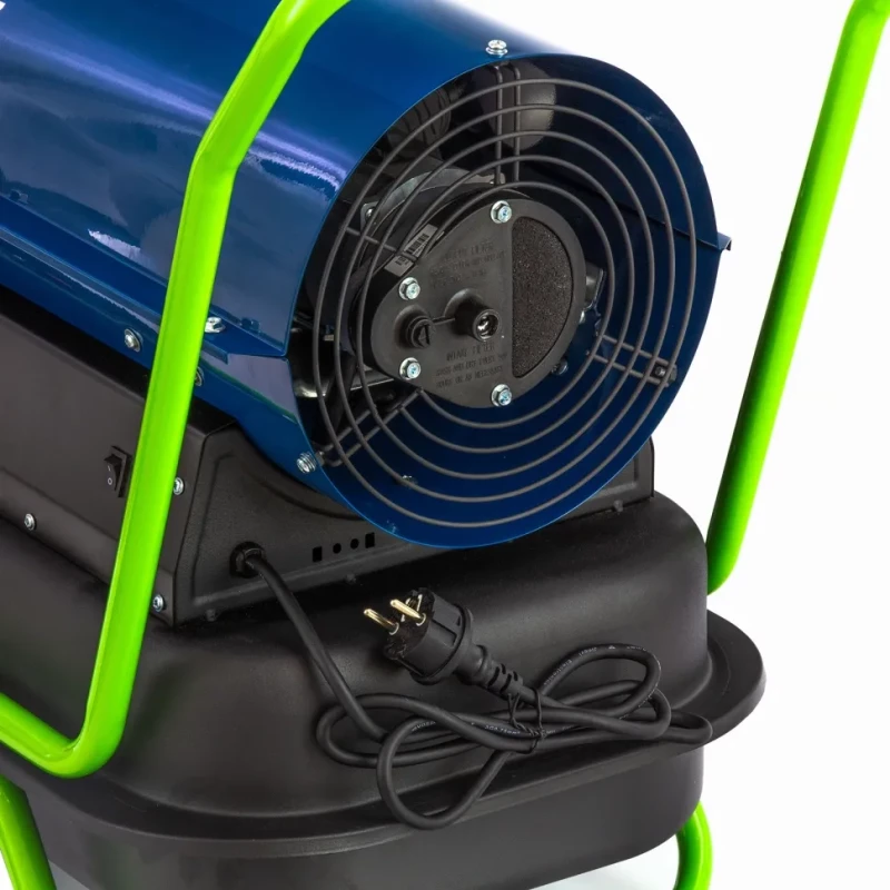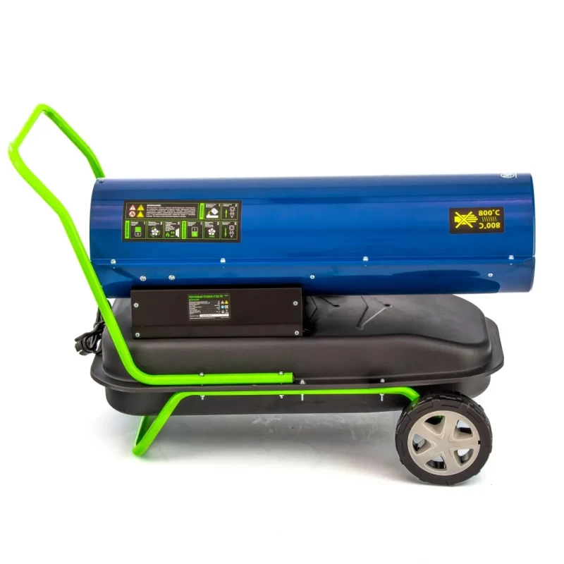Преимущества: Пушка может работать с любым видом дизельного топлива: летним, зимним и арктическим. Встроенная система безопасности в случае затухания пламени, обесточивания или перегрева отключает подачу топлива. Теплоотражающий экран служит для равномерного прогрева помещения, не допуская потери тепла. Встроенный фильтр грубой очистки предохраняет топливную систему от засорения частицами грязи. Система прямого нагрева не допускает рассеивания теплого воздуха, направляя его на конкретную точку для быстрого обогрева. Специальный датчик облегчает контроль уровня топлива для своевременной заправки. Пушку легко транспортировать и перемещать по рабочей площадке благодаря подставке с ручкой и колесами.