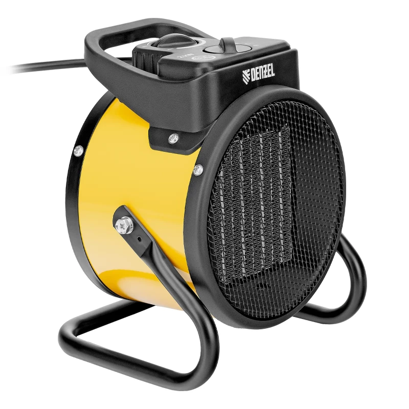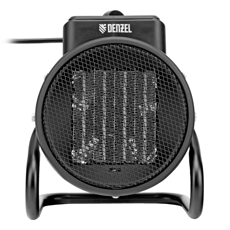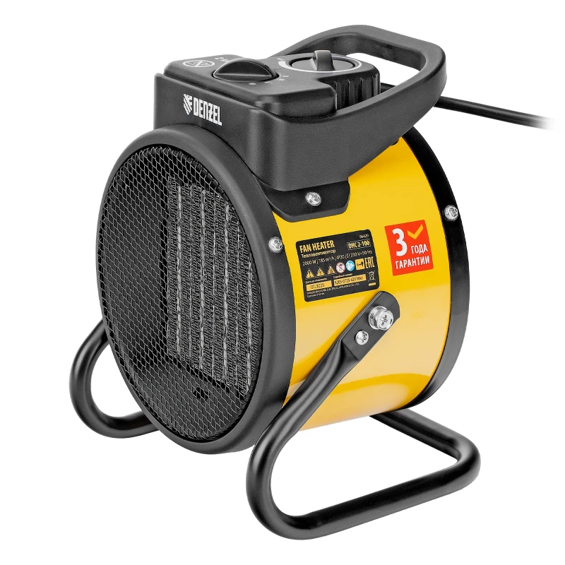Тепловая пушка (тепловентилятор) Denzel DHC 2-100 96429 с керамическим нагревателем потребляет мощность 0,025, 1 или 2 кВт и пригодится в любую погоду: в холод она обогреет помещение, а в жару ее можно использовать как вентилятор. Также применяется во время отделочных работ для просушки поверхностей — окрашенных и оштукатуренных стен, стяжек. Максимальной мощности 2 кВт хватит для обогрева помещения площадью до 20 кв.м. Работа тепловой пушки не доставляет дискомфорт, безопасна для здоровья людей и животных, поскольку керамический нагревательный элемент не сушит воздух и не выделяет вредных веществ.